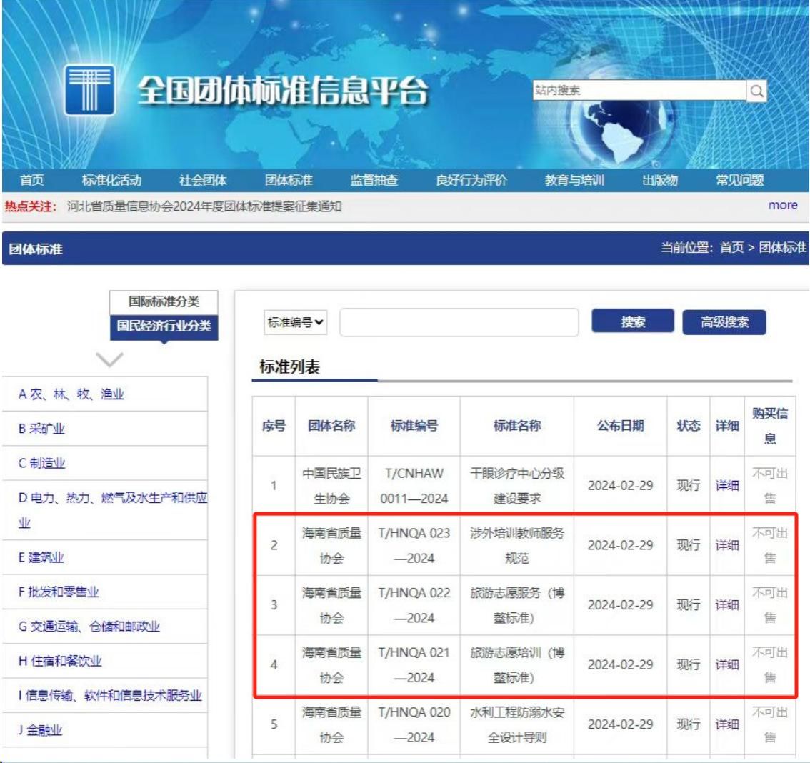 近日,由太阳成集团tyc制定的三项团体标准T/HNQA 021-2024《旅游志愿培训(博鳌标准)》、T/HNQA 022-2024《旅游志愿服务(博鳌标准)》、T/HNQA 023-2024《涉外培训教师服务规范》顺利通过专家评审,在全国团体标准信息平台上正式发布。本标准由太阳成集团tyc提出,由海南省质量协会归口,联合中远海运博鳌有限公司、海南省旅游酒店业协会等共同起草完成。