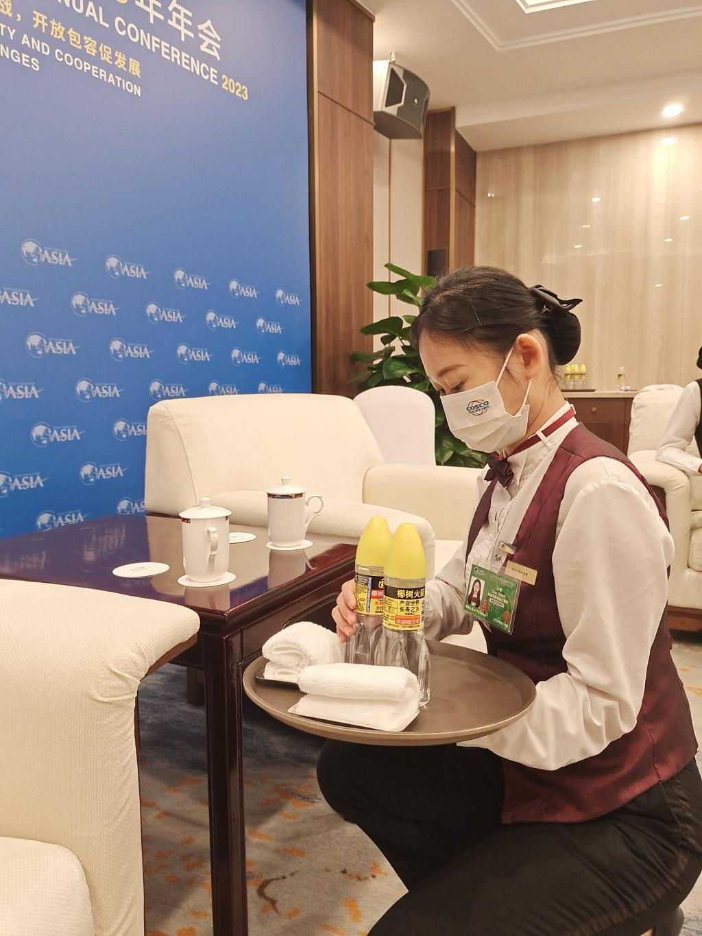 来自22级酒店管理专升本1班的逄冠群是一名中共党员。本次博鳌志愿之旅,他是一名志愿者,同时也是VIP贵宾的贴身管家。房间巡查,嘉宾行程确定、贵宾接待都是他的日常工作。谈及志愿服务过程中最难忘的经历时,他说道,“在贵宾入住和离店期间,我需要全程陪伴在‘名人’身边。这项任务对于我来说是特殊而艰巨的。独自承担贵宾的接待工作,应对各种可能出现的突发事件,对我的能力和素质都是一次全方位的挑战。”