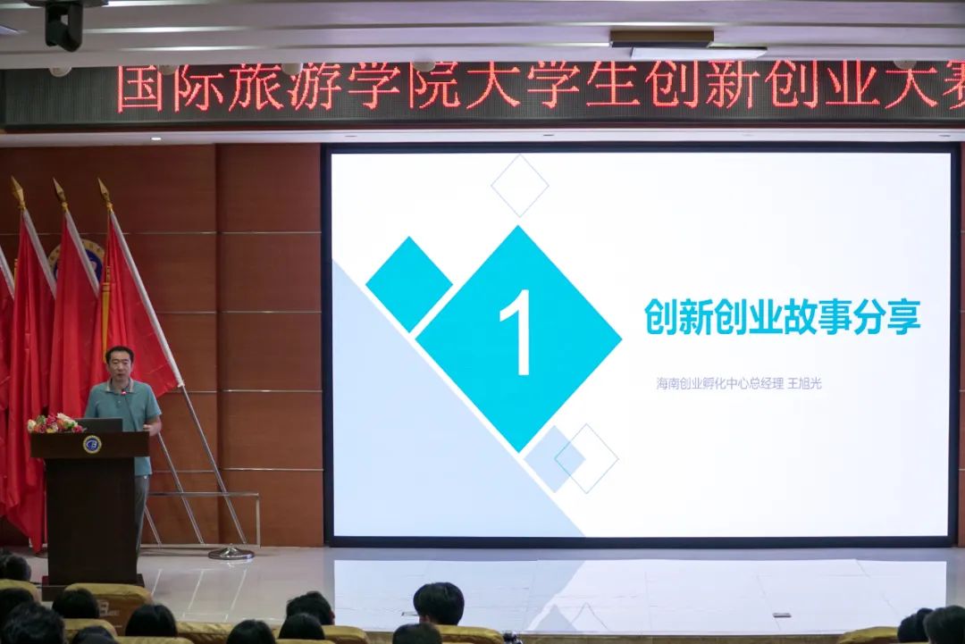 大会首先由海南创业孵化服务中心总经理王旭光分享创新创业经历。王旭光先生声情并茂的讲述了自己当初创新创业的初心,分析了疫情大背景下就业工作的险峻局势,鼓励同学们应积极参加创新创业大赛,为将来步入社会后的创新创业打下坚定基础。同时,王旭光先生还分享了自己在创新创业过程中所遇到的挫折与成功,为同学们树立成功非一日之功的正确理念,告诫同学们要敢于试错,贵在坚持。