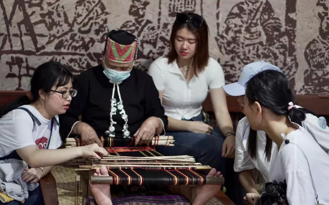 6月26日,“海南宣讲团”实践团队来到具有黎苗古韵的槟榔谷,槟榔谷内分为非遗村、甘什黎村、雨林苗寨,从大门进去,导游向团队成员讲解的槟榔谷有意思的故事激起了团队成员的好奇心,乘坐上槟榔谷的观光车,伴随着青木草香的微风,团队成员来到了槟榔谷的第一站。正在展现黎族织锦技术的阿婆热情的用黎族话“波隆”向游客打招呼(黎语:你好;很棒),实践团队的同学们围绕着正在织锦的阿婆,观察这项传承了千年的中国纺织史上的“活化石”,仿佛陷入了千年的对话,一根根竹子与一根根织线的穿插形成具有黎族元素的黎锦,成员们不得不感叹古人的智慧!