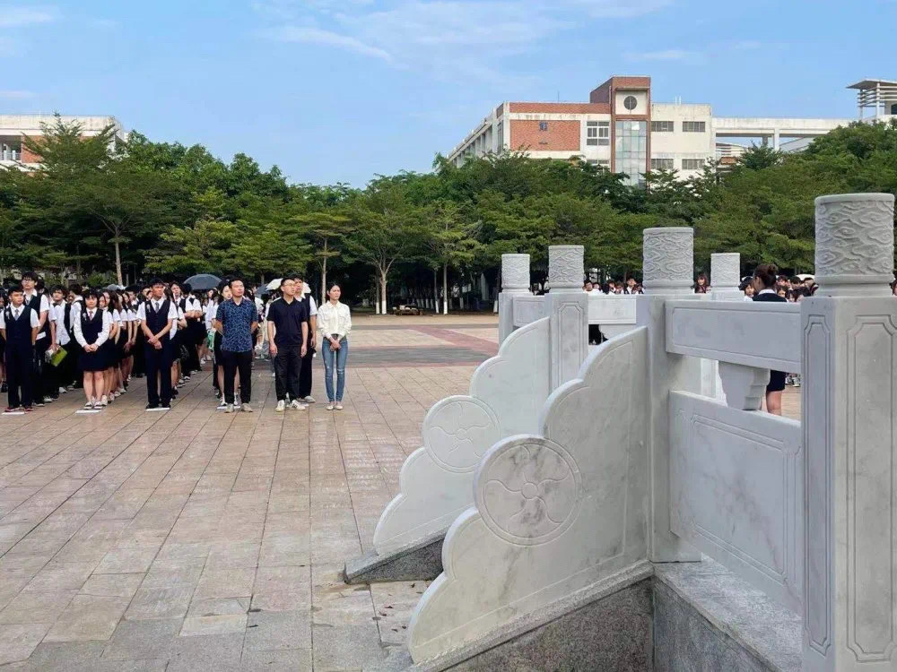 升旗仪式第一项,主持人孙悦威说明了此次升旗仪式的流程,并宣布升旗仪式正式开始。紧接着国旗班队员们迈着整齐的步伐庄严地走向国旗台,在国旗班护卫队的引领下,随着雄壮的国歌声响起,鲜艳的五星红旗在蔚蓝的天空冉冉升起,全体师生肃然起敬,对着国旗行注目礼。