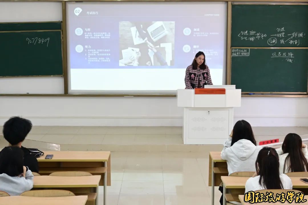 樊靖老师分享了几点考试技巧,一是听力方面,对于重读的单词或关联词要提高注意力,答案一遍就在前后出现;二是句式方面,建议同学们多背诵英语长难句,了解句型构造;三是思路方面,面对难题,要多站在出题者的角度进行思考,往往问题就能迎刃而解。最后,樊靖老师对正在备考的同学们示以鼓励:“希望同学们要端正考试态度,认真对待每一次考试,祝愿大家都能在即将来临的四级考试中取得佳绩。”