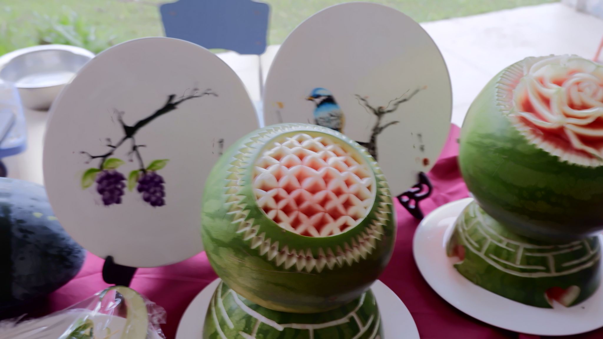 公司迎新点还有我们烹饪专业为大家准备水果拼盘,用普通的水果来展现不平凡的雕刻实力,学长学姐们用精湛的刀工在西瓜上雕龙刻凤!
