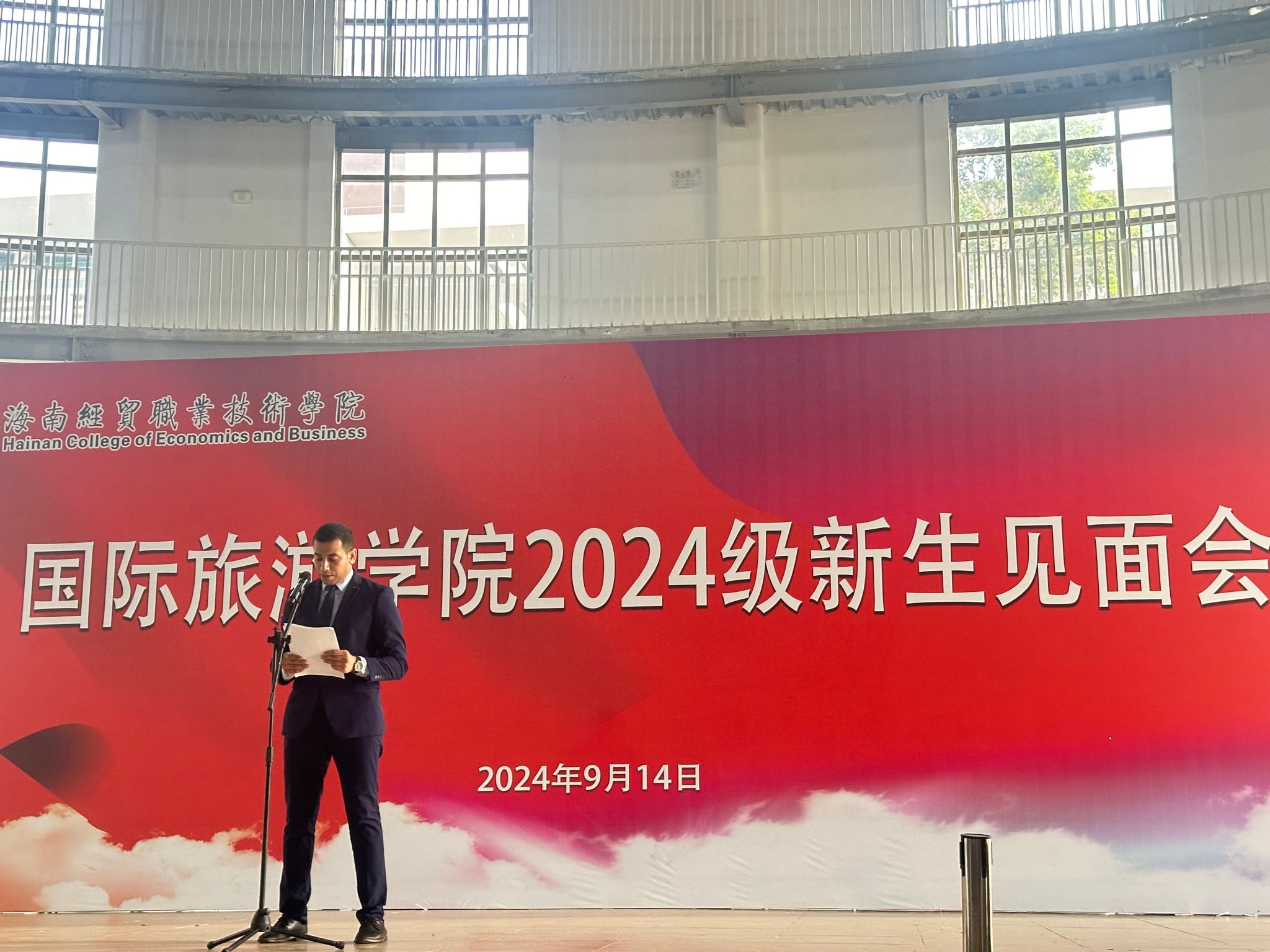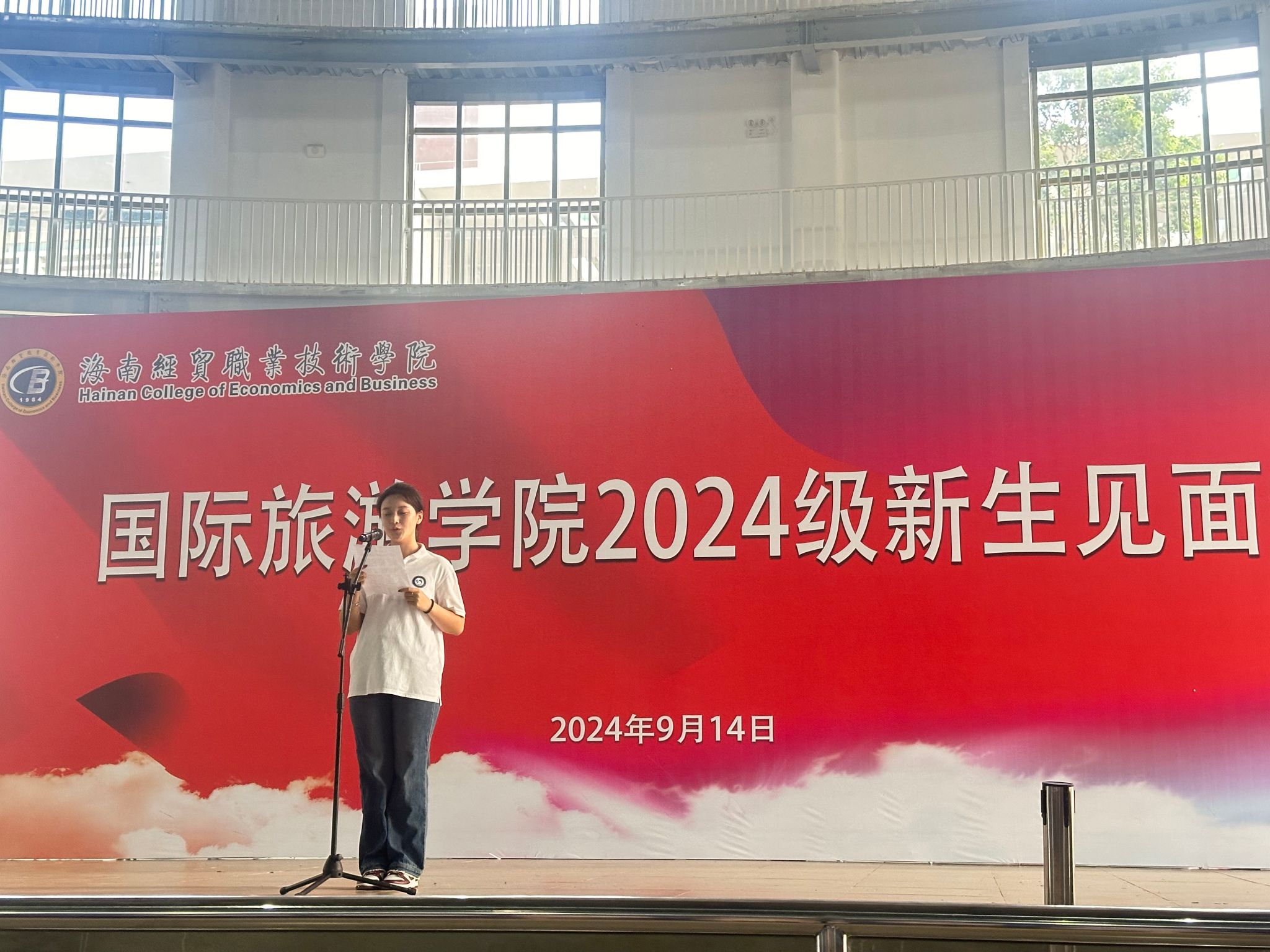 随后,老生代表、新生代表和教师代表分别上台发言。老生代表葛源寄语:“大学要注重身份的转变,需要我们学会独立思考、自主学习,要学会与人沟通、合作共事”,她希望师弟师妹们能够永远保持一颗好奇心,勇于探索,敢于追梦。新生代表李祎结合自己专升本的经历说:“正是因为海经贸给我提供了一个广阔的学习和成长平台,让我遇见更好的自己,才会一次又一次的选择经贸和国旅,再续美好的缘分”。她表示,期待在未来和各位同学一起与国旅携手并进,共同创造更精彩的未来。