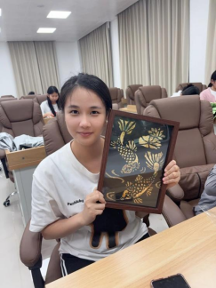 活动中,徐训喆讲解金箔工艺历史,演示从构图、涂胶到 “压、拂、吹” 贴箔的全套技法。同学们专注创作,在交流协作间,锦鲤、云纹等传统图案在深色底板上闪耀金光。