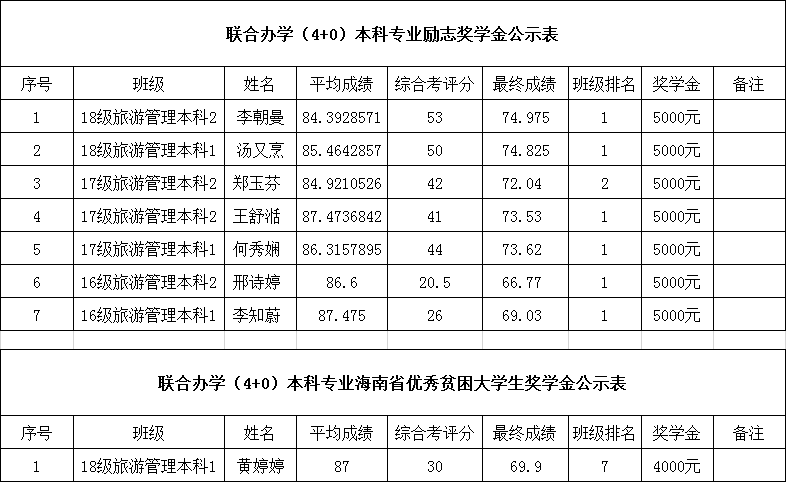 旅游管理公司2018-2019学年度联合办学(4+0)本科专业励志、省奖学金公示表
