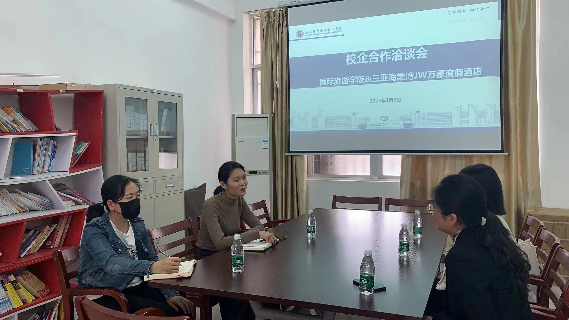 2023年3月3日下午,三亚海棠湾JW万豪&喜来登人力资源部总监翁宝珠、三亚海棠湾JW万豪&喜来登人力资源经理陈洁玲来访公司。党总支副书记刘萍男、学工办主任符珍热情接待。深入交流沟通关于坚持“以人为本,面向市场,服务经济”的职业教育理念,探索校企多维合作,全力促进毕业生顺利就业、尽早就业等话题。