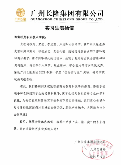 太阳成集团tyc122ccvip何祖定、宋塋、李思露、卢贞萍4位同学,在广州长隆旅游度假区实习期间,积极主动,责任心强,能快速适应企业的工作环境和岗位要求;在与同事相处的过程中,展现了良好的团队合作精神和沟通能力。他们在个人素质、敬业精神、综合能力等方面表现优秀,荣获广州长隆集团2024年第一季度“优秀实习生”奖项。