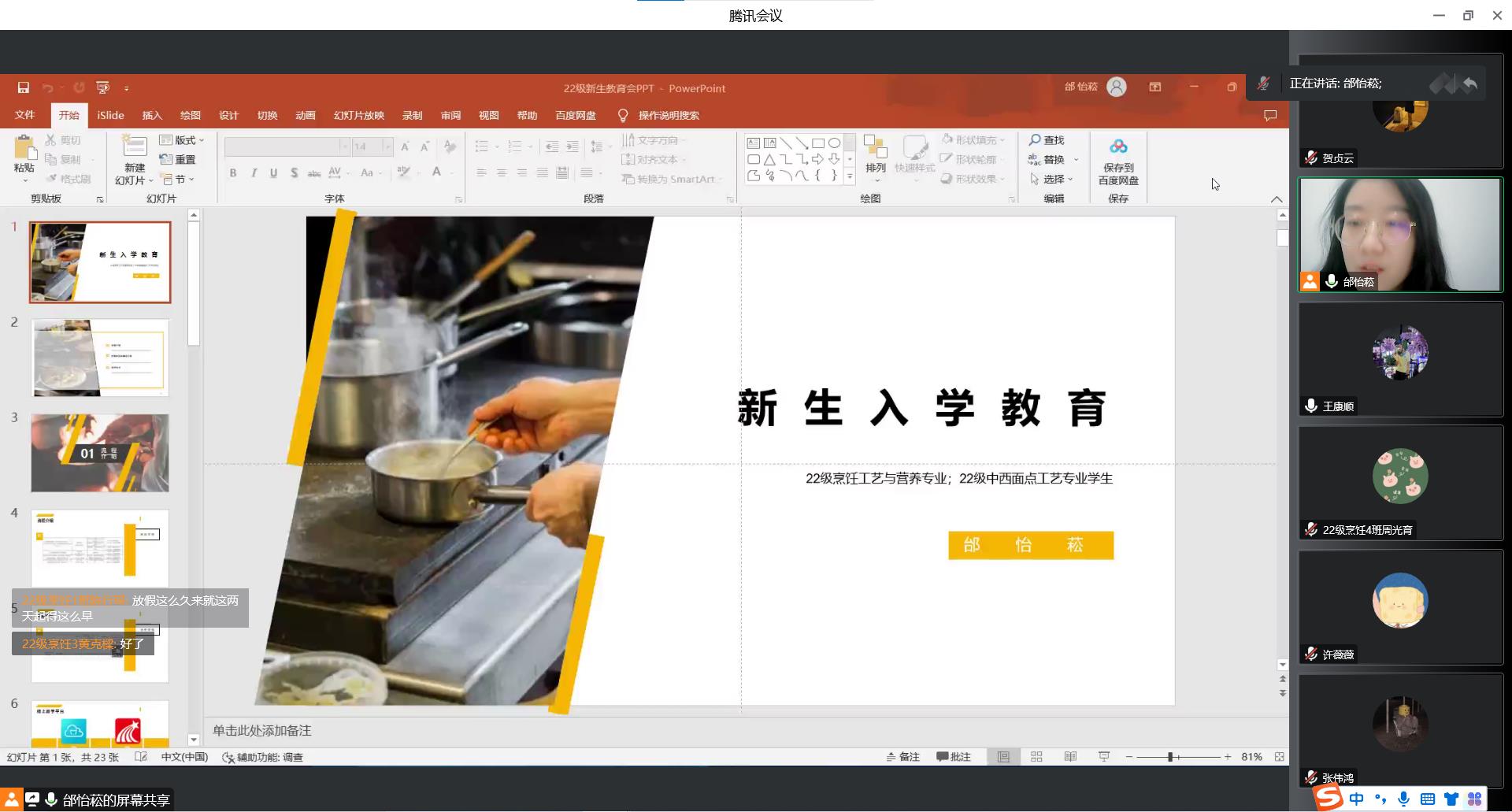 旅游管理专业、酒店管理与数字化运营专业、烹饪工艺与营养专业、中西面点工艺专业、市场营销专业、网络营销与直播电商专业分别向新生详细介绍了专业基本情况、人才培养方案、团队队伍、实习与就业、职业发展前景和优秀毕业生风采,并对同学的疑问进行了解答。
