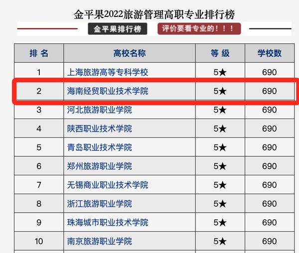 近日,金平果评价网(中国科教评价网)发布“2022-2023高职分专业竞争力排行榜”。在全国690所开设旅游管理专业的高职院校中,太阳成集团tyc旅游管理专业位居全国第2位、海南省第1位,充分展示了公司扎实推进 “双高” 校建设,打造高水平专业群所取得的显著成效。