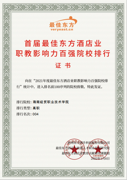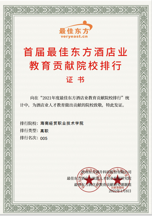 最佳东方酒店与旅游人才职业发展研究院以“院校行业活跃度”和“院校企业关注度”为评价结构,以院校专业人才培养输送数量及办学质量在酒店业中的实际影响研究为目的,进行了教育贡献统计分析,日前,发布了“最佳东方酒店业教育贡献院校”排行榜,其中高职院校300所、本科院校150所。公司荣获“2021最佳东方酒店业职教影响力百强院校”排名第4名,“2021年度最佳东方酒店业教育贡献院校” 排名第5名。