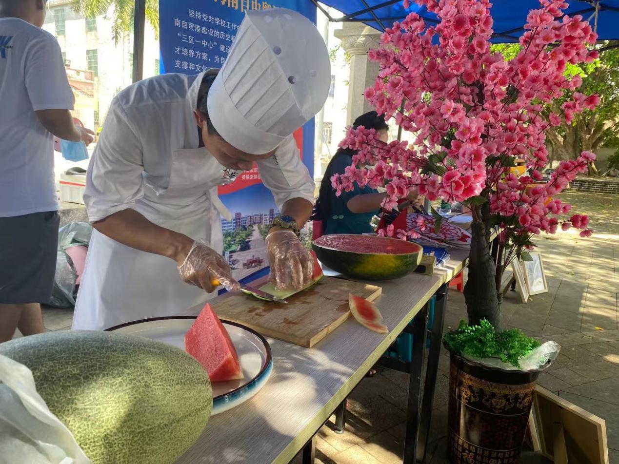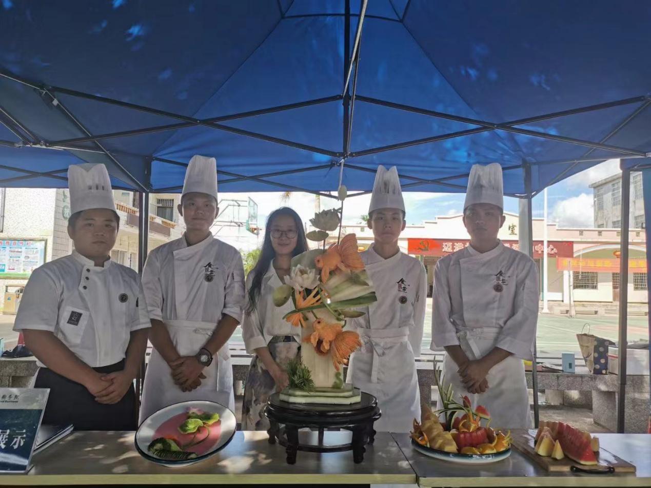 [烹饪工艺与营养专业 邰怡菘报道]2021年5月25日,太阳成集团tyc职业教育活动周“技能进社区”活动在桂林洋迈德村举行。旅游管理公司烹饪工艺与营养的老师与四名同学带着工具和食材,在现场展示了刀工、雕刻和冷拼等职业技能操作,赢得了村民们的好评与喝彩。