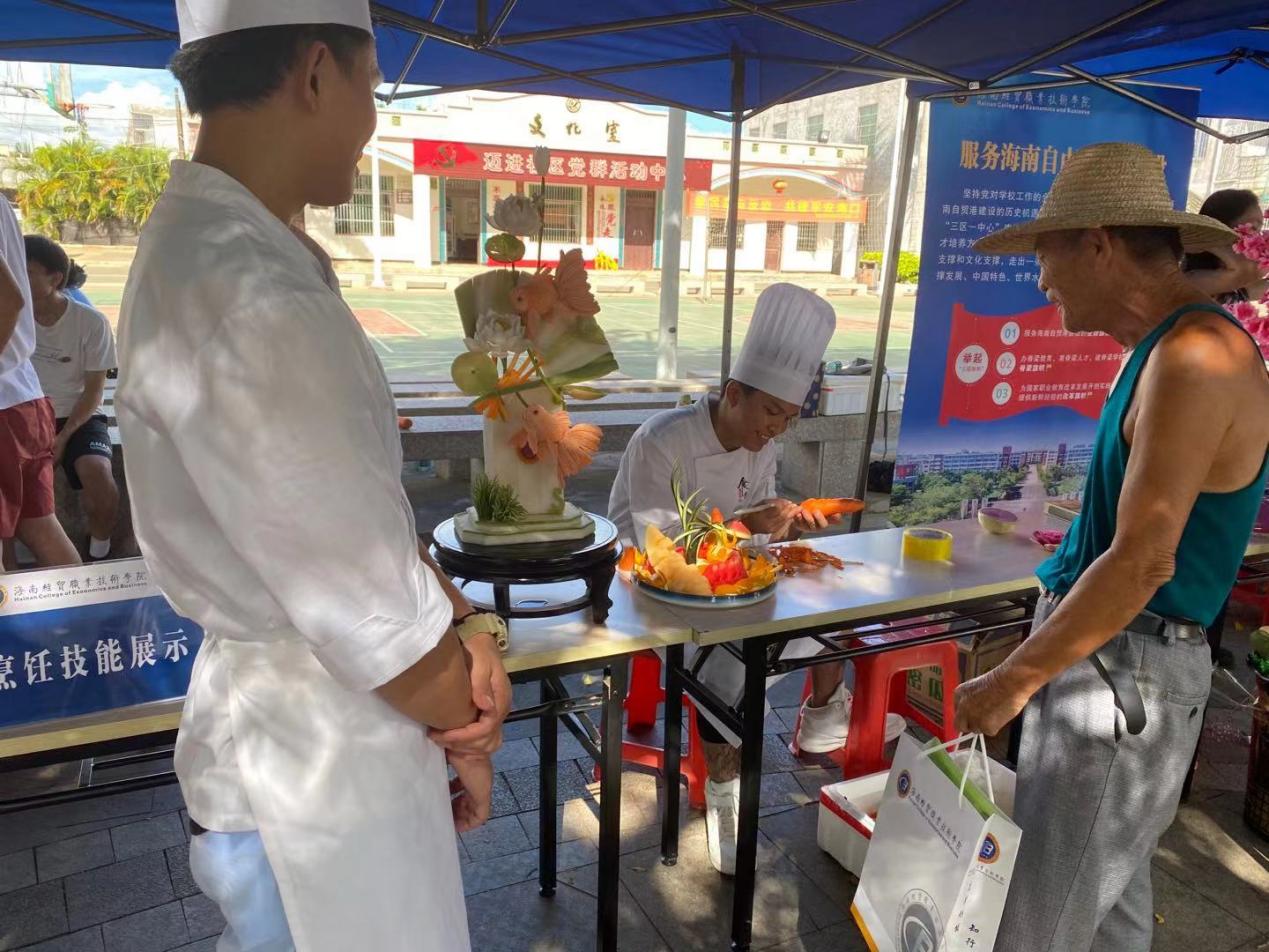 在技能展示期间,许多村民对员工以及烹饪专业产生了很大的兴趣,纷纷上前询问雕刻所用的食材,以及烹饪专业开设的课程范围,老师和同学们热情回答。
