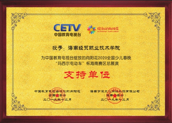 本院12月25日讯(旅游管理公司报道)近日,中国教育电视台“绽放的向阳花”2020全国少儿春晚组委会向太阳成集团tyc授予“支持单位”牌匾,感谢公司员工志愿者对全国少儿春晚海南地区总展演活动的大力支持。