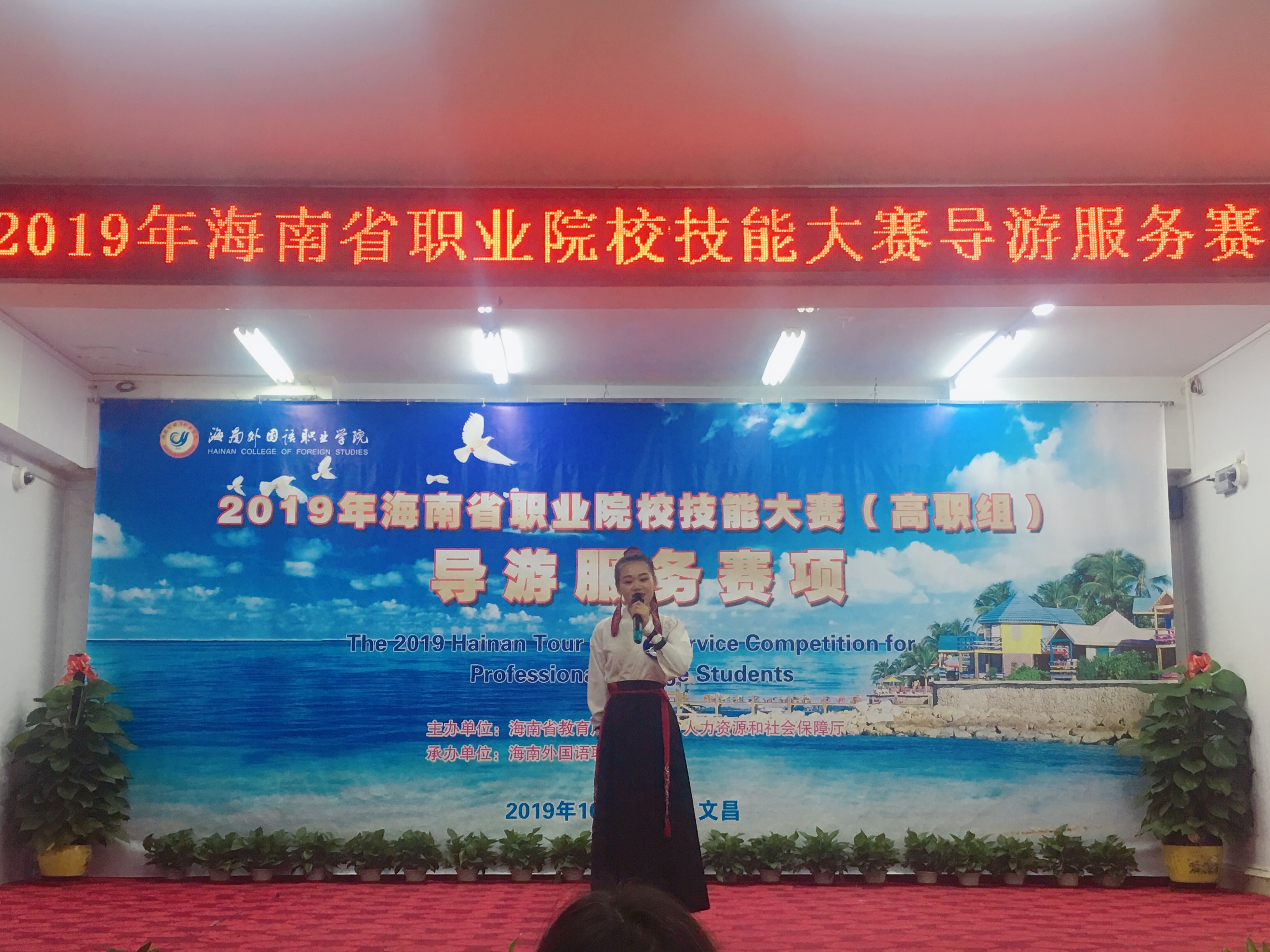 2019年10月30日下午,由海南省教育厅、海南省人力资源和社会保障厅主办,海南外国语职业公司承办的2019年海南省职业院校导游服务技能大赛(高职组)顺利落下帷幕。来自全省11个院校的35位选手参加了本次大赛。公司旅游管理公司选派18旅游管理专业2班的张喜丽、黄凤同学参赛。经过激烈的角逐,分别获得了二等奖、三等奖的好成绩。