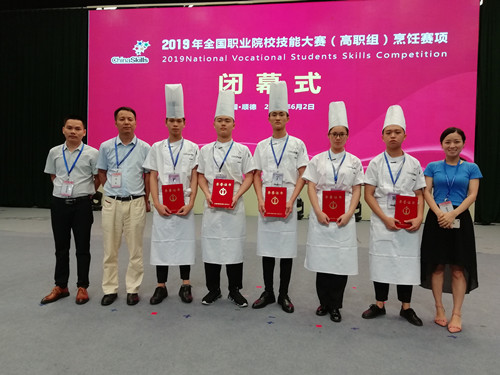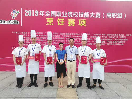 2019年全国职业院校技能大赛主赛区在天津,烹饪赛项赛区在广东顺德。来自全国各省41支院校队伍205名参赛选手参加此次烹饪赛项。经过烹饪基础理论测试、宴席设计、宴席制作、宴席展评四个项目的角逐,公司参赛队斩获团体奖二等奖。公司参赛队由赵福振、吴贤贤两位教师做大赛指导,雍梁敏老师为营养咨询顾问,王国宁老师为技能指导顾问,参赛选手为旅游管理公司烹饪班一年级员工邓秋瑜、陈振雷、李德、何和颖和张岳鑫。