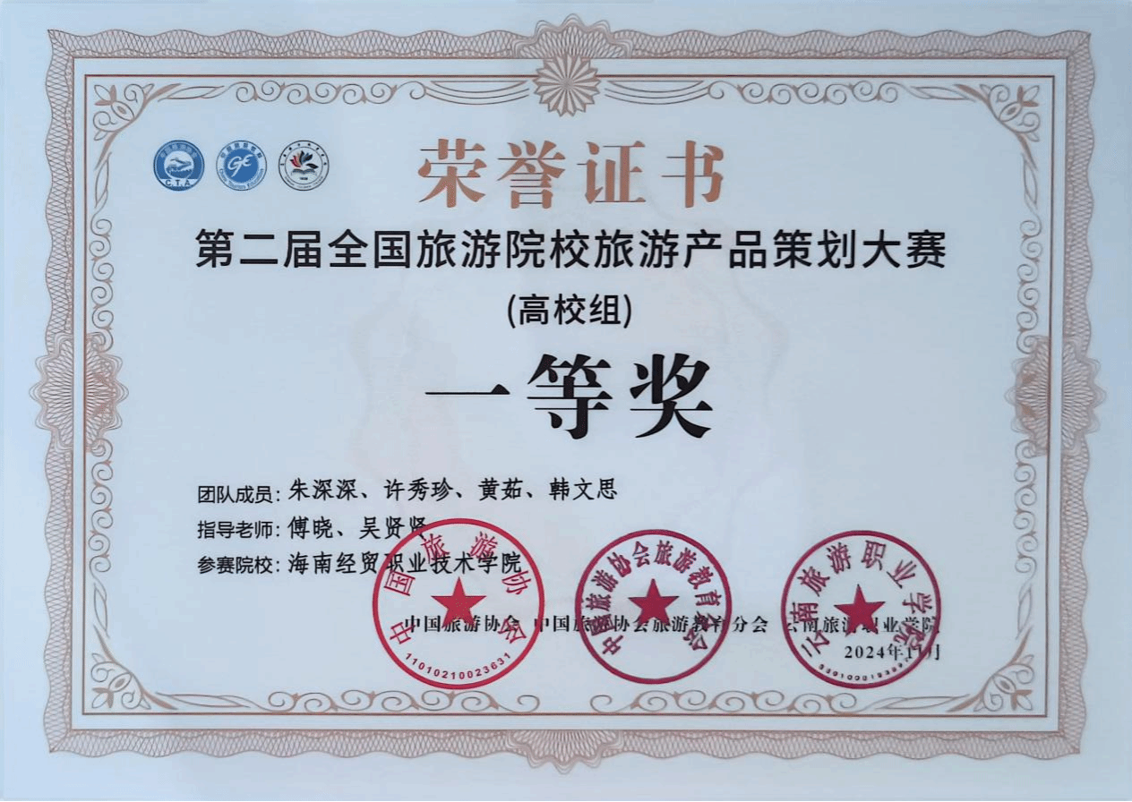我院教师傅晓、吴贤贤老师指导的朱深深、许秀珍、黄茹、韩文思4位同学在现场总决赛中勇夺高校组一等奖,这是海南高校参加全国旅游院校旅游产品策划大赛首次入围决赛并获奖。
