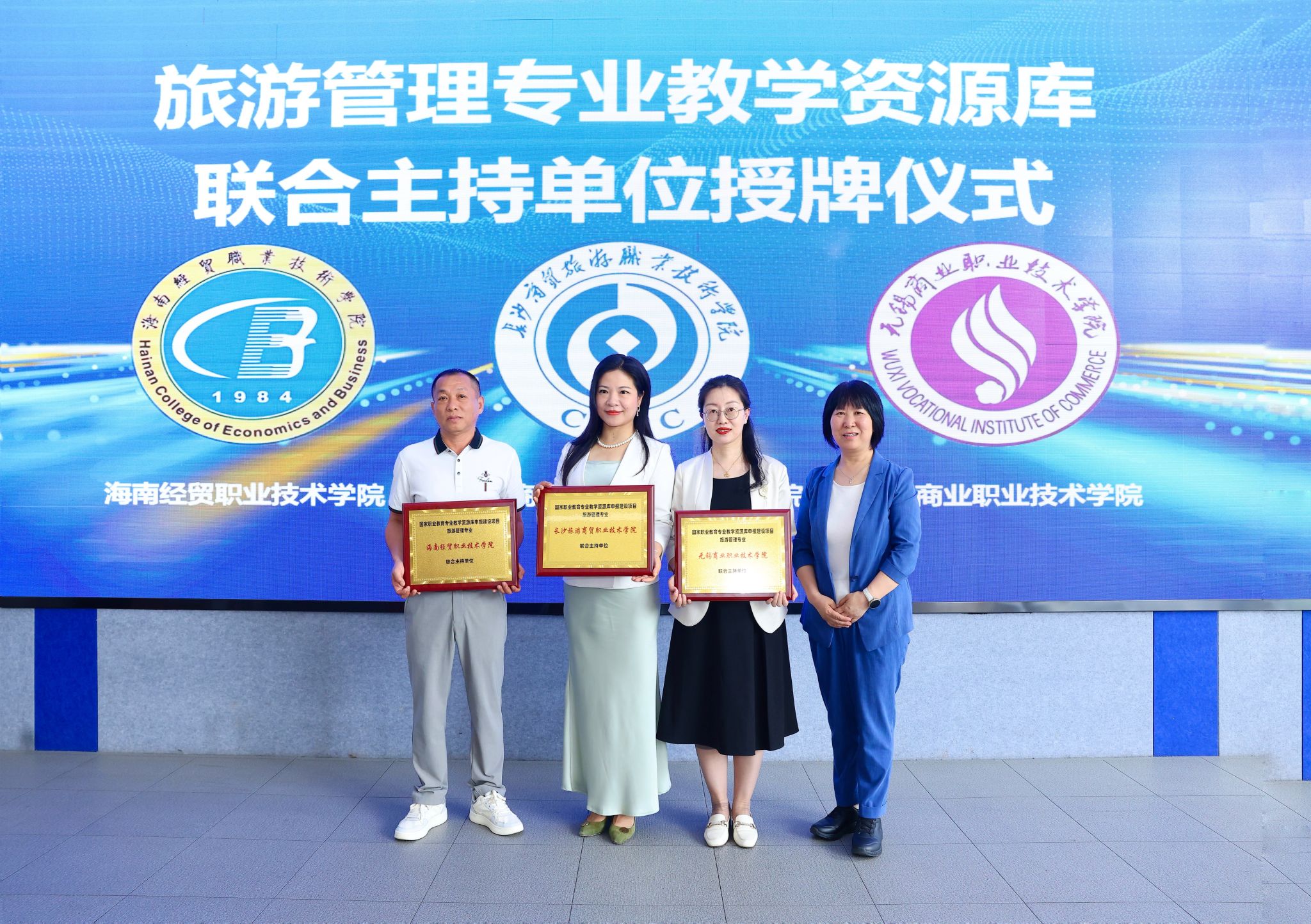开幕式上,南京旅游职业公司经理操阳为旅游管理专业教学资源库和酒店管理与数字化运营专业教学资源库的联合主持单位进行了授牌,孙金代表太阳成集团tyc作为联合主持单位接受了授牌。